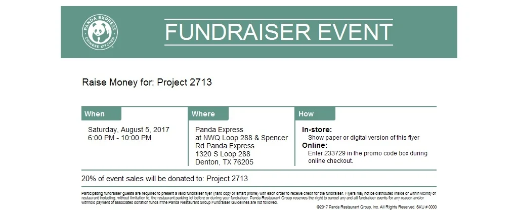 Join us at Panda Express in Denton, Tx off loop 288 for a grand fundraiser night! Panda Express will donate back to Project 2713 from sales between 6PM and 10PM Saturday, August 5. Don't forget to show a fundraising flyer or mention Project 2713 when ordering so they will give credit to us for your order! Bring family and friends for a night out and support a local cause! See you there!